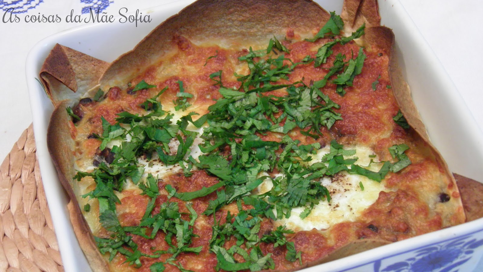 Entretanto unta-se um tabuleiro com a colher de azeite que resta, e forra-se com as tortilhas de forma a que o fundo e paredes fiquem cobertos.