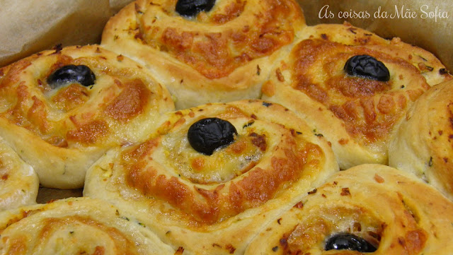 Enrola-se como se fosse uma torta e corta-se em 16 pedaços iguais. Transferem-se os caracóis para um tabuleiro quadrado, forrado com papel vegetal e coloca-se uma azeitona em cada caracol. Tapa-se com película aderente e deixa-se repousar durante 40 minutos, ou até dobrar de volume.